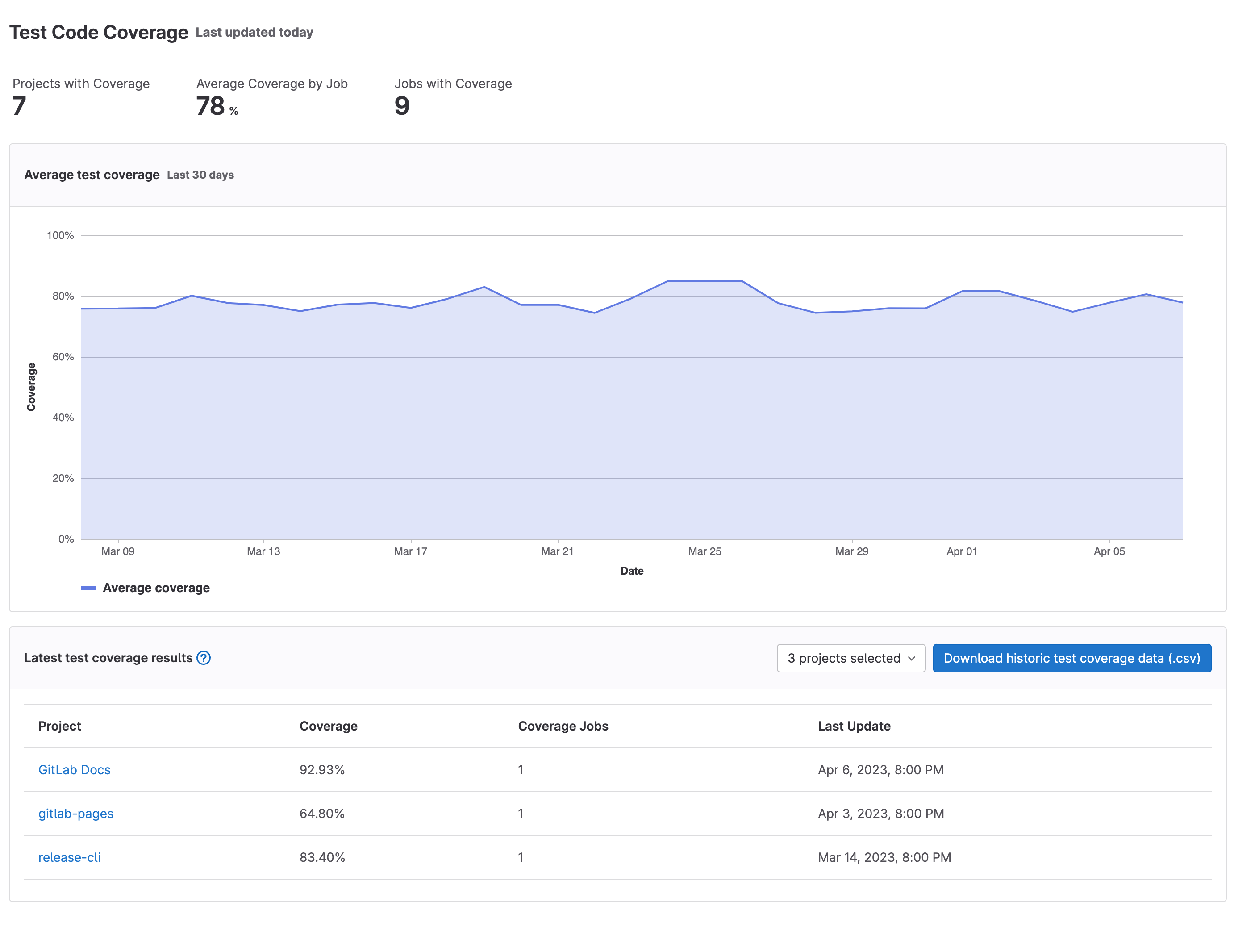 To see the all the project's code coverage under a group over time, you can find view group repository analytics.