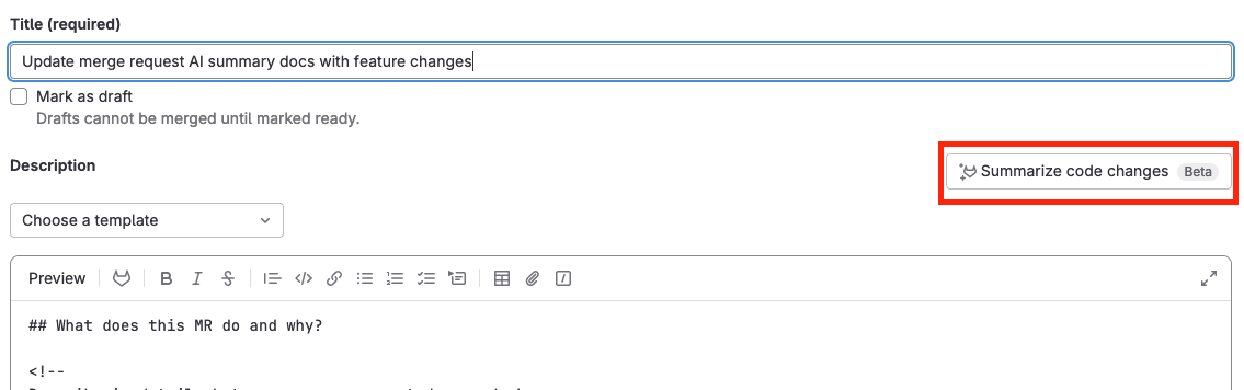 GitLab Duo Merge request summaries can be added to your merge request description when creating or editing a merge request. To add a summary, select Summarize code changes. The generated summary is added to the merge request description where your cursor is.