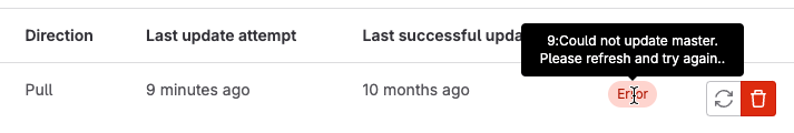 When mirroring fails, project maintainers can see a link similar to {warning-solid} Pull mirroring failed 1 hour ago. on the project details page. Select this link to go directly to the mirroring settings, where GitLab displays an Error badge for the mirrored repository. You can hover your mouse cursor over the badge to display the text of the error: